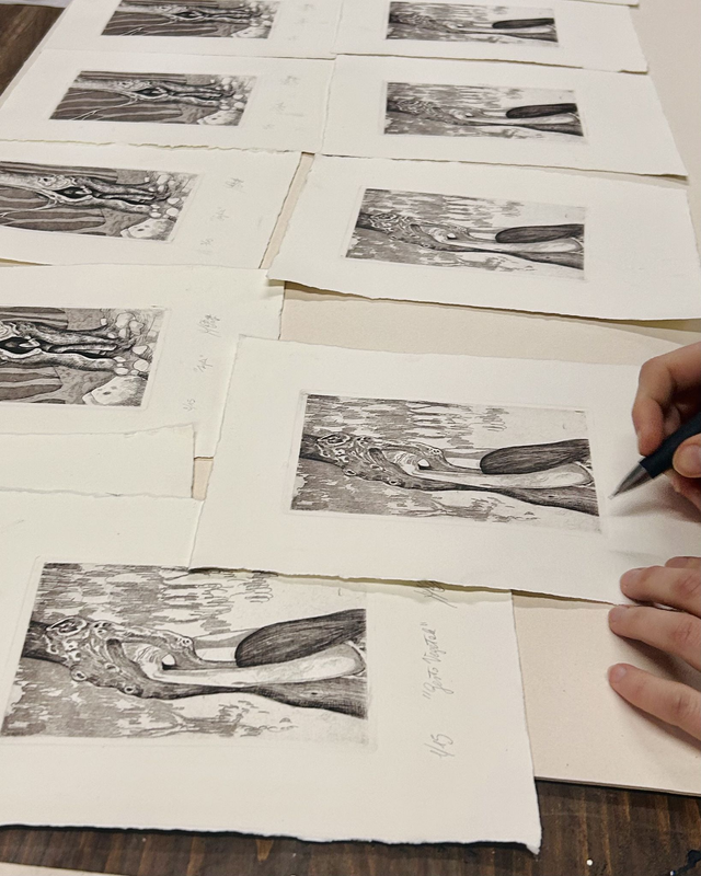 Ho pensato attraverso queste acquaforti, di creare una collezione di gesti vegetali effimeri di esplorazione, raccontare l'unicità di alcuni alberi evocando una simbiosi e vicinanza al nostro essere animali umani e mettere in luce una connessione profonda e quasi magica con la natura.